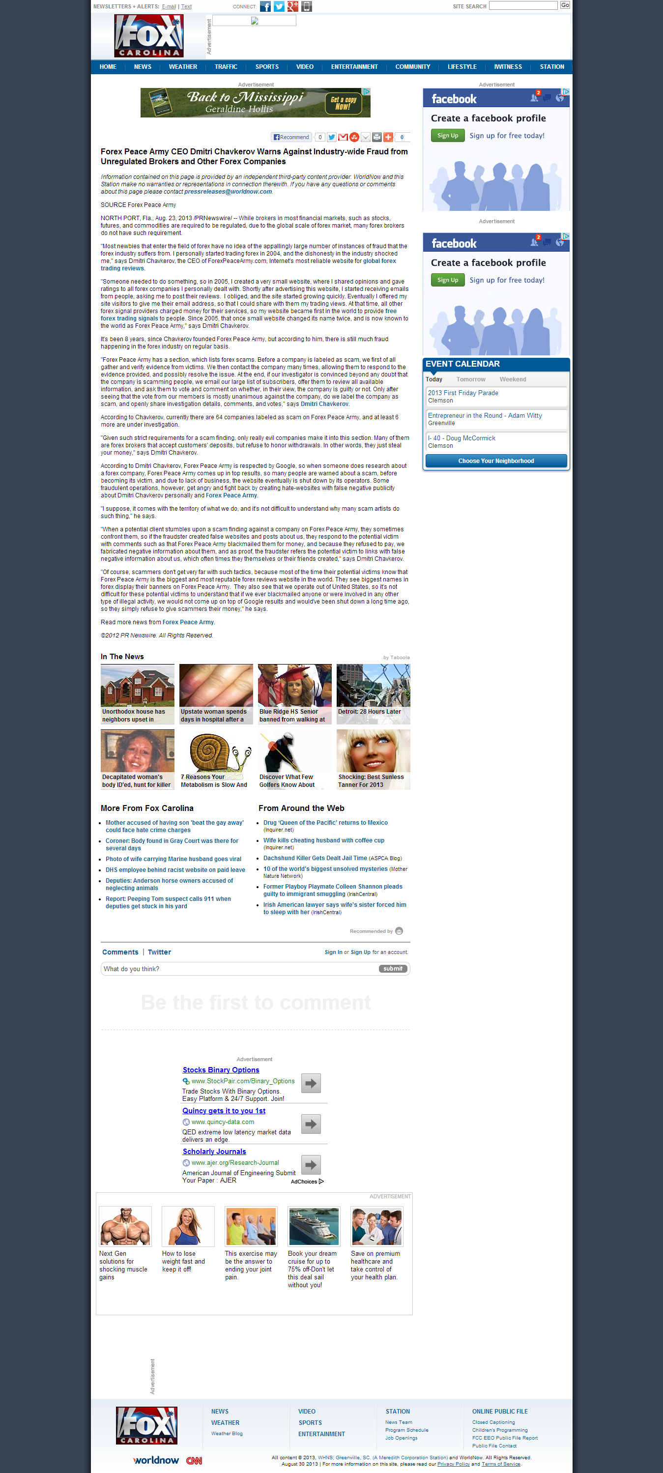 Forex Peace Army | Unregulated Forex Fraud Press Release in WHNS-TV FOX-21 (Greenville, SC)