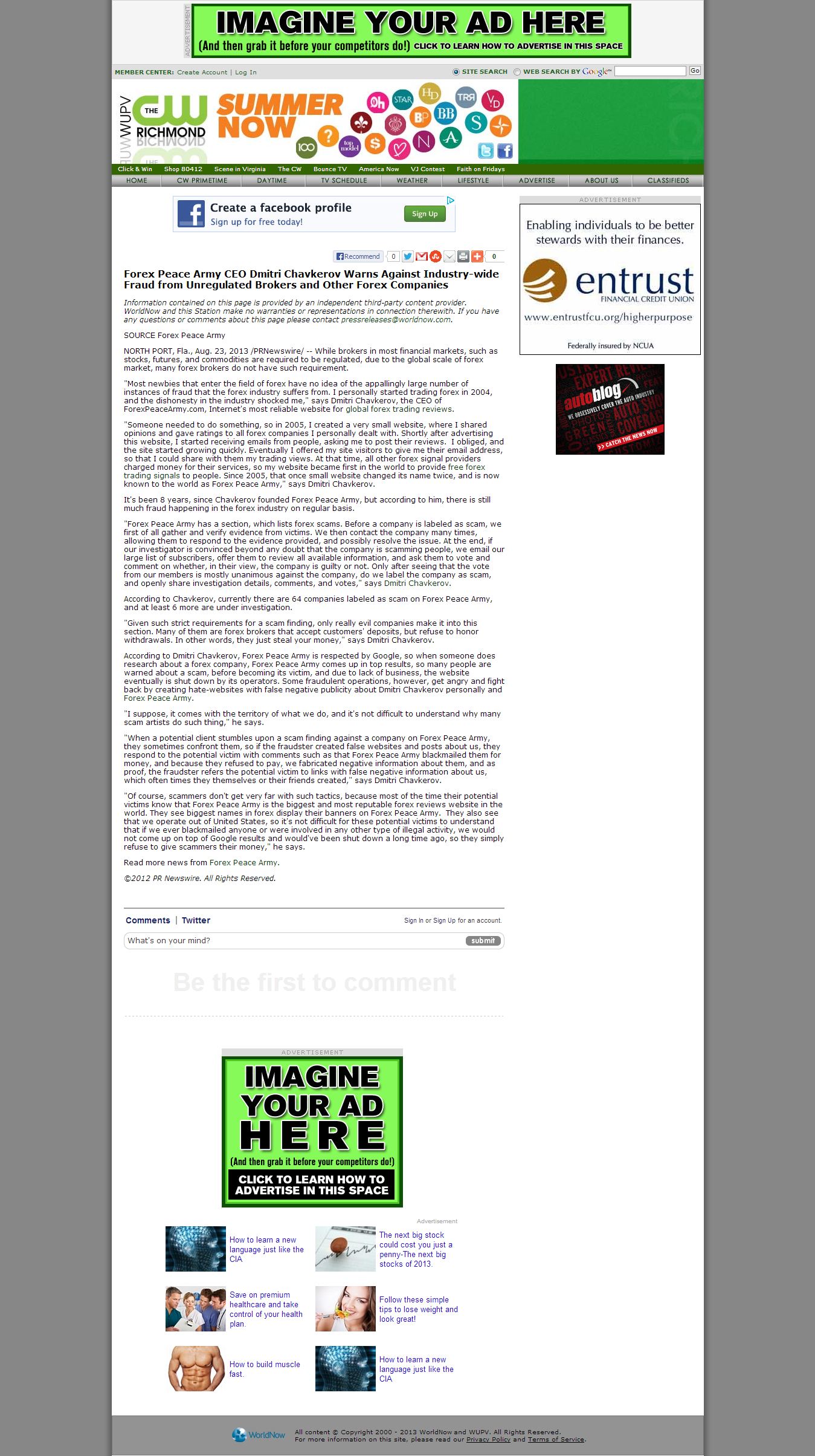 Forex Peace Army | Unregulated Forex Fraud Press Release in WUPV-TV CW-65 (Ashland, VA)