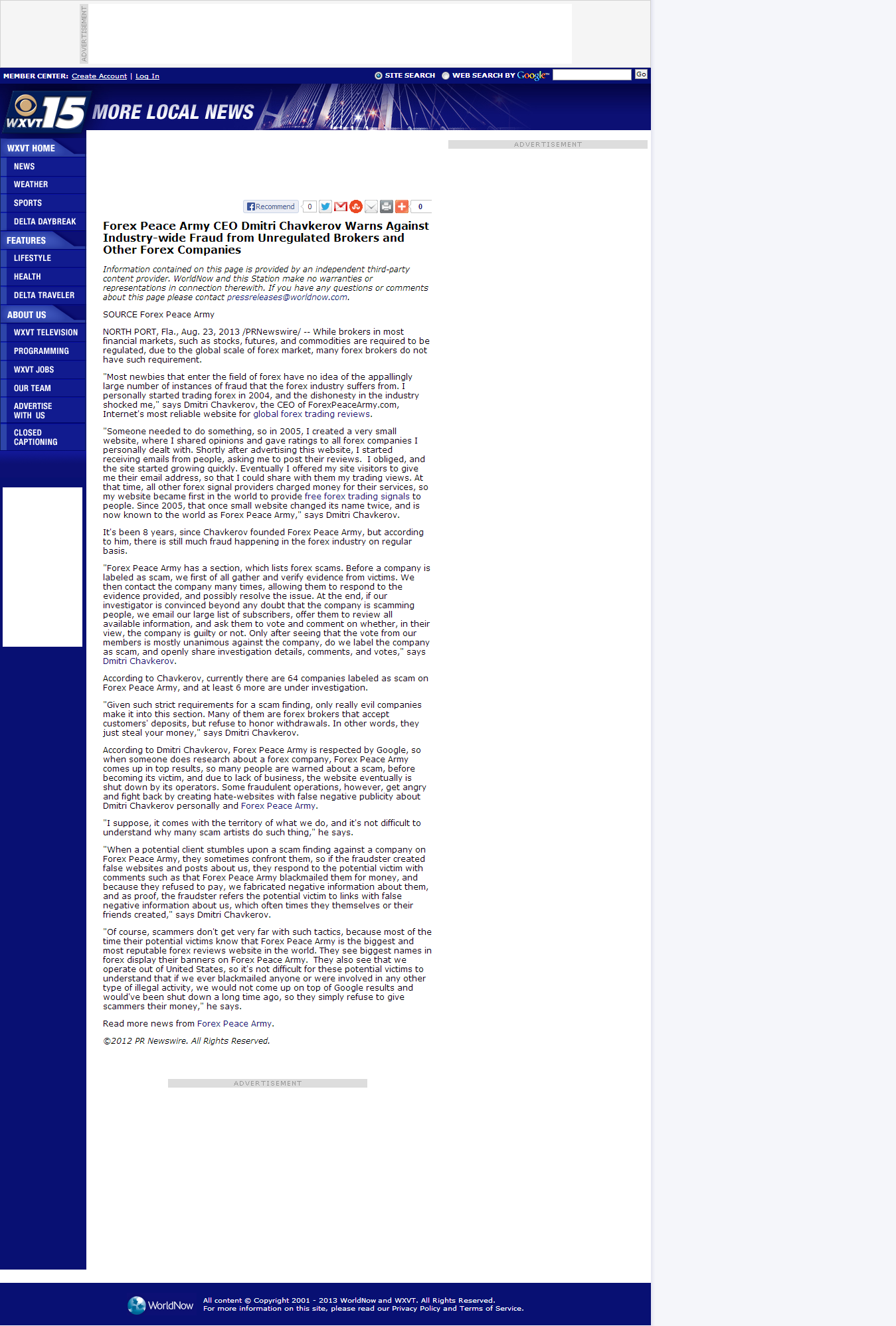 Forex Peace Army | Unregulated Forex Fraud Press Release in WXVT-TV CBS-15 (Greenville, MS)